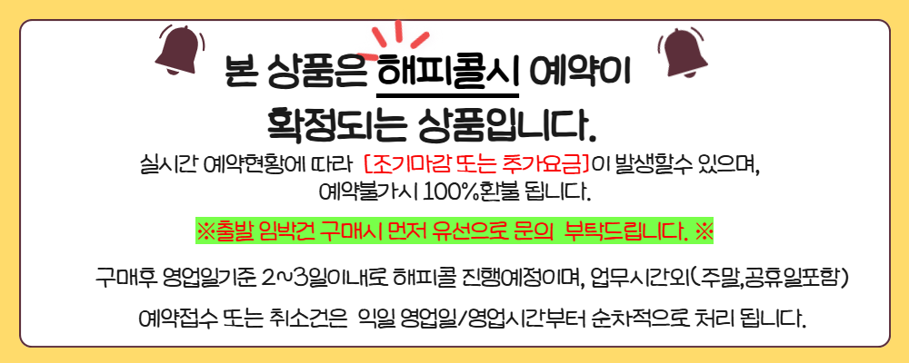 ※ 24개월 미만 무료 (24개월 이상부터 성인/소아/유아 가격동일합니다.) ※ 타지역 출발은 유선 02-355-0810으로 문의 주시기 바랍니다. ※유류할증료 안내※ 상기 여행경비에 유류할증료는 4월기준으로 적용되었으며 추후 유가와 환율에 따라 추가요금이 발생될 수 있습니다.