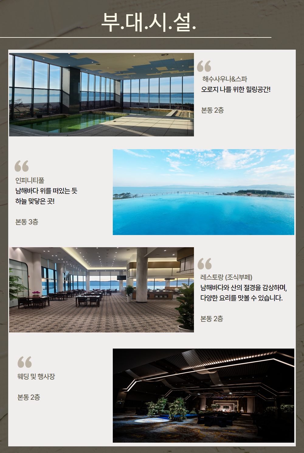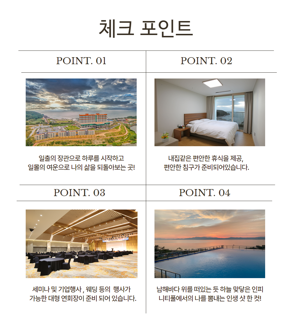 대자연이 펼쳐진 공간에서 당신의 품격을 더욱 높여드립니다. 특별한 당신께 어울리는 품격과 여유를 즐길 수 있는 곳. 이곳에서 안락한 휴식과 다양한 즐거움을 누리십시오.